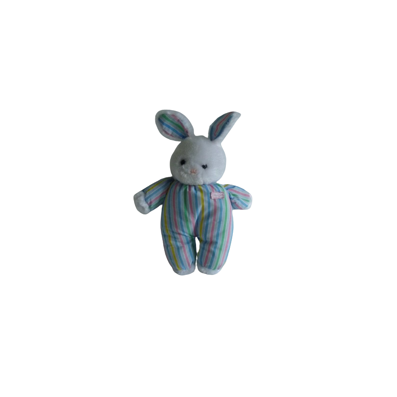 Doudou peluche lapin vintage 37 cm environ tout compris, blanc tissu rayé multicolore. Etat : Parfait état