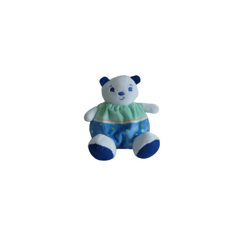 Doudou peluche boule ours 18 cm environ, blanc bleu vert morif fleur feuillage cœur étoile. Etat : Comme neuf