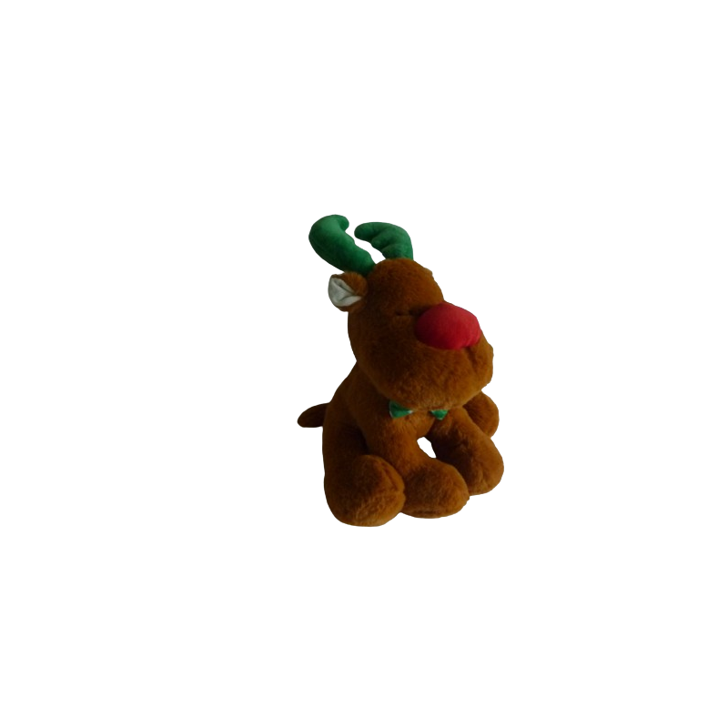 Doudou peluche renne élan 38 cm environ tout compris position assise, marron rouge vert. Etat : NeufDestinataire :