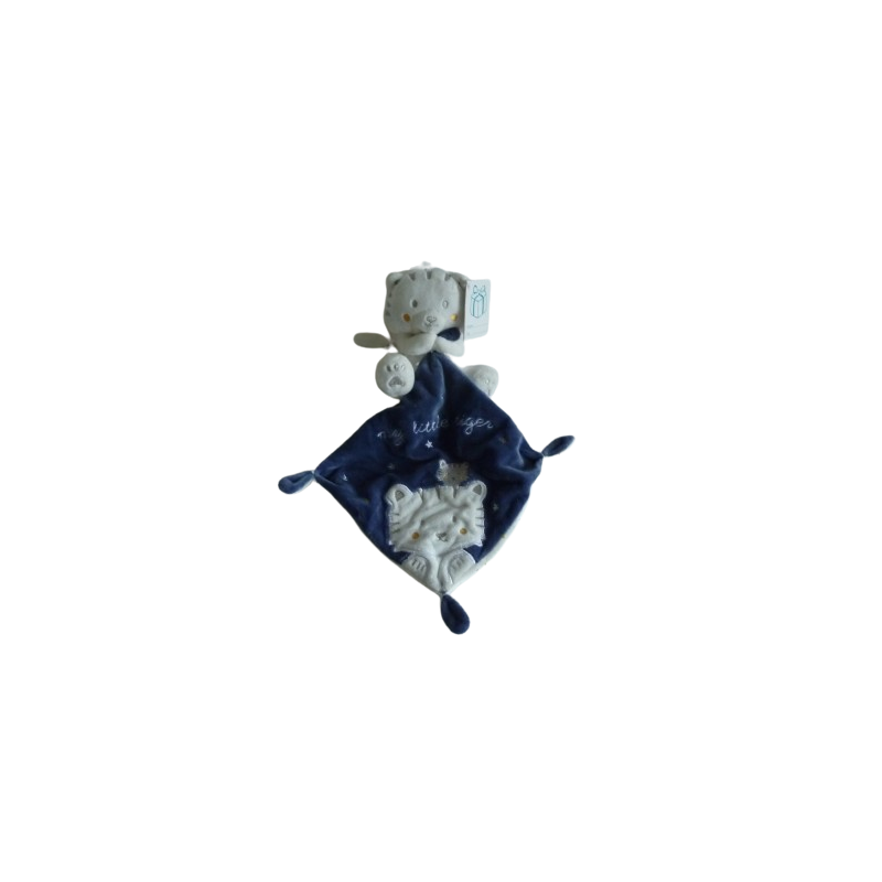 Doudou peluche tigre 12 cm environ blanc, mouchoir 16x16 cm environ, bleu motif tigre étoiles My Little Tiger brodé. Etat : Neuf