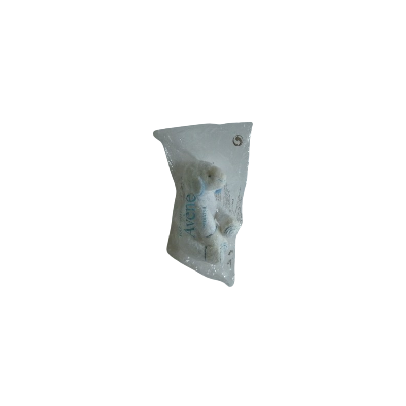 Doudou peluche mouton agneau 20 cm environ de longueur, blanc spirales bleus sous les pattes. Etat : Neuf