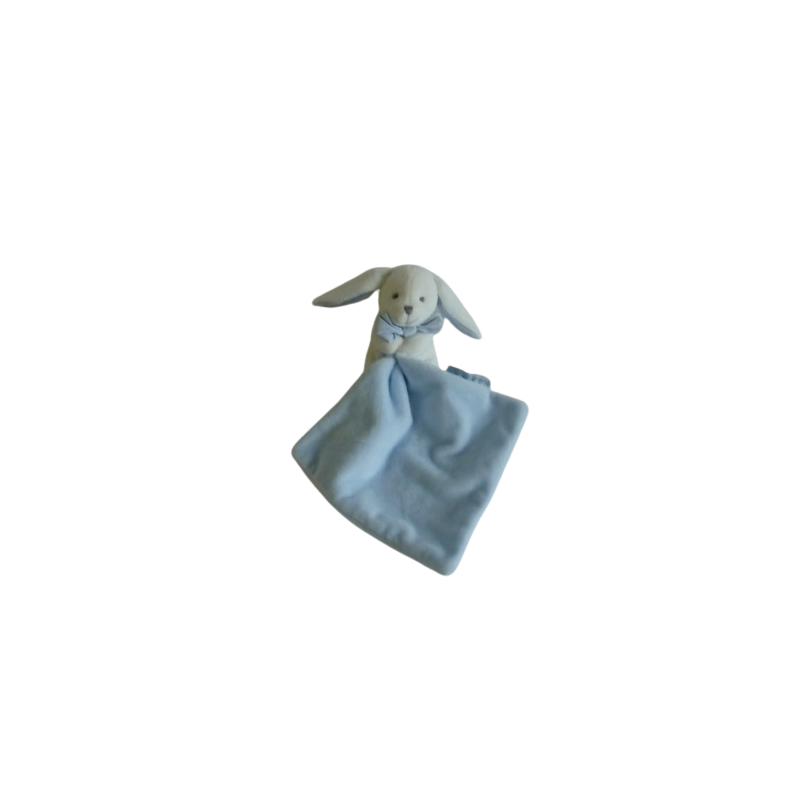 Doudou peluche lapin 11 cm environ, blanc nœud bleu, mouchoir bleu 16,5x16,5 cm environ. Etat : Comme neufDestinataire :