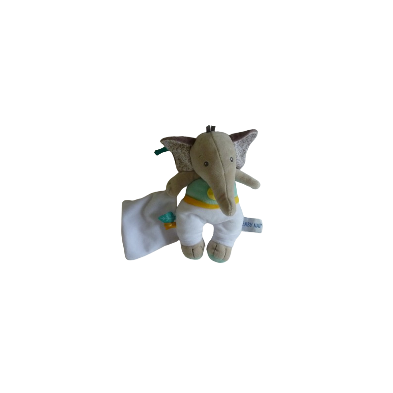 Doudou peluche éléphant 25 cm environ blanc gris vert mouchoir blanc. Etat : Comme neuf