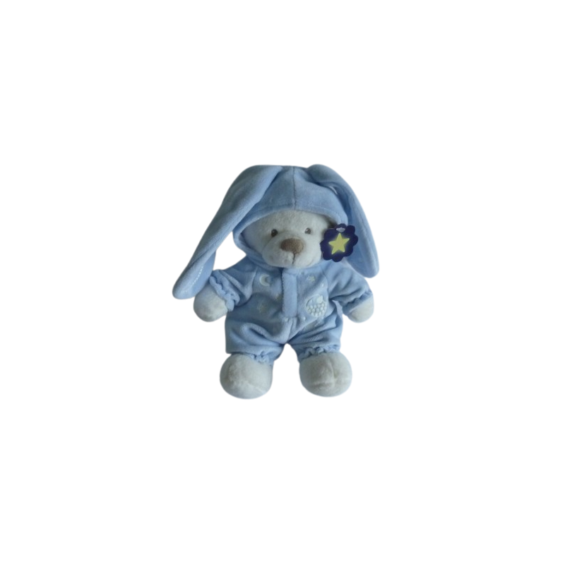 Doudou peluche ours déguisé en lapin 27 cm environ sans compter les oreilles, blanc bleu motif lune étoile poussin, brille la nuit. Etat : NeufDestinataire :