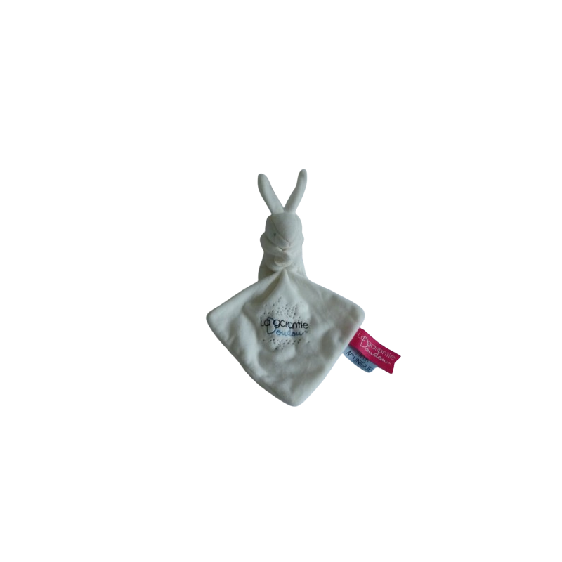 Doudou peluche lapin blanc attache tétine 11 cm environ sans compter les oreilles, mouchoir : blanc 16x16 cm environ La Garantie doudou Brodé. Etat : Comme neufDestinataire :