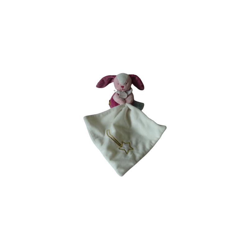 Doudou peluche lapin 17 cm environ sans compter les oreilles rose fuschia blanc, mouchoir 20x20 cm environ blanc motif étoile. Etat : Bon état (le doudou est en très très bon état sauf les oreilles qui sont usées. Doudou est idéal pour doudou de secours)Destinataire :
