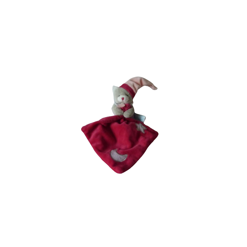 Doudou peluche chat 17 cm environ sans compter le bonnet, gris rose mauve rouge, mouchoir 18x18 cm environ rouge lune étoile luminsescentes. Etat : Comme neuf