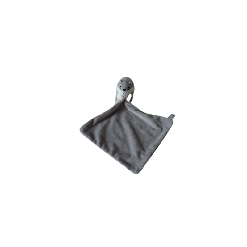 Doudou peluche écureuil gris blanc rose 11 cm environ, grelot, mouchoir gris 24x24 cm environ. Etat : Comme neuf