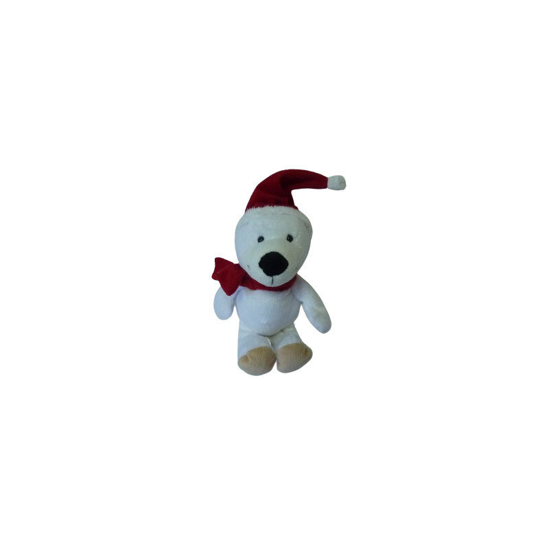 Doudou peluche ours 24 cm environ sans compter le bonnet, blanc écru bonnet et écharpe rouge. Etat : Comme neuf