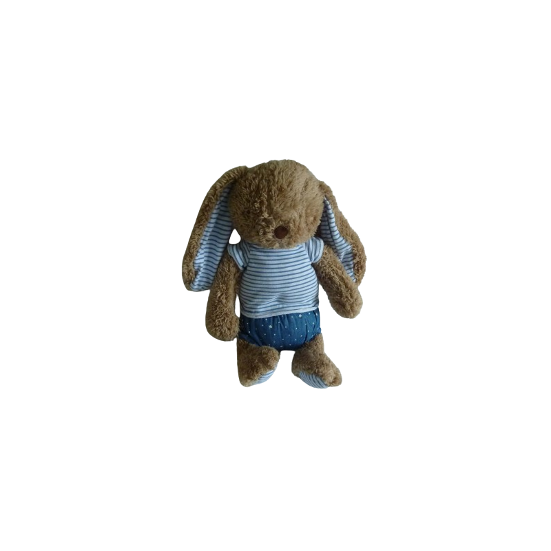 Doudou peluche lapin 34 cm environ, tshirt rayé bleu blanc short bleu motif étoiles, intérieur des oreilles rayures bleu blanc. Etat : Comme neuf