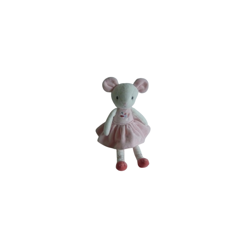 Doudou peluche souris 30 cm environ, rose blanc motif fleurs. Etat : Comme neuf