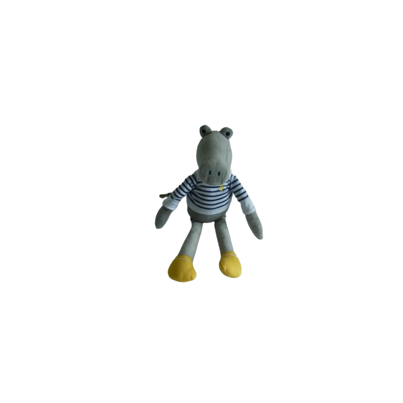 Doudou peluche crocodile 34 cm environ, gris tshirt marin. Etat : Comme neuf (étiquette de la marque coupée)Destinataire :