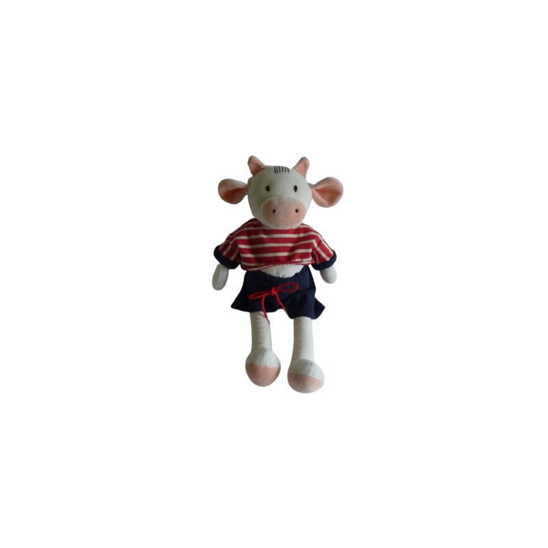 Doudou peluche vache 44 cm environ, tshirt rayé blanc rouge short bleu marine. Etat : Comme neuf
