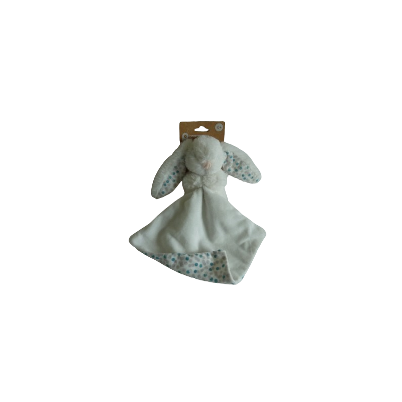 Doudou peluche lapin 19 cm environ blanc motif pois, mouchoir : 18x18 cm environ blanc motif pois. Etat : NeufDestinataire :