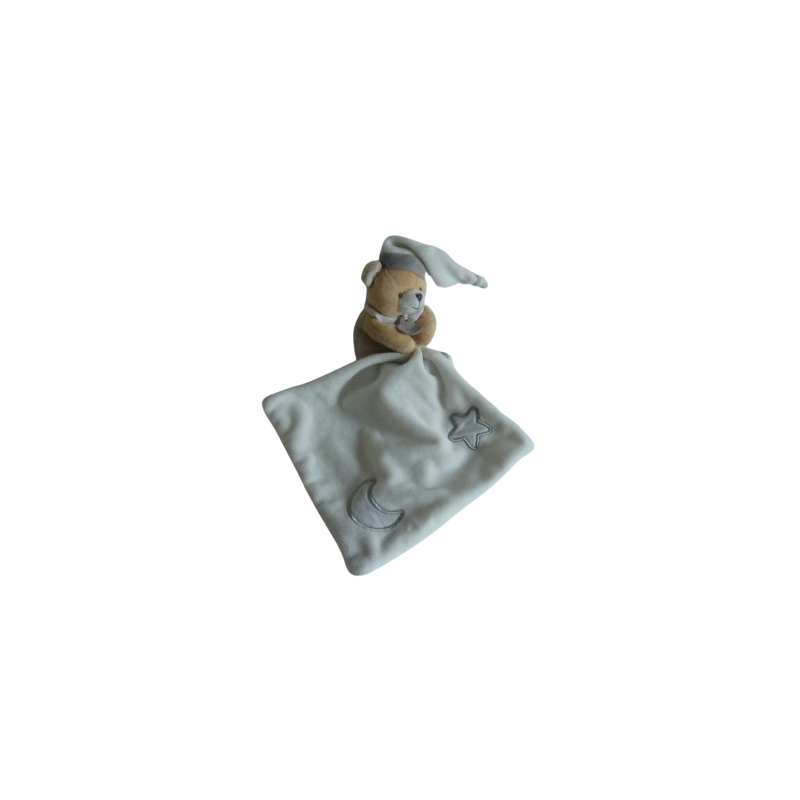 Doudou peluche ours 16 cm environ sans compter le bonnet, marron gris taupe, mouchoir blanc motif étoile lune 19x19 cm environ. Etat : Comme neuf