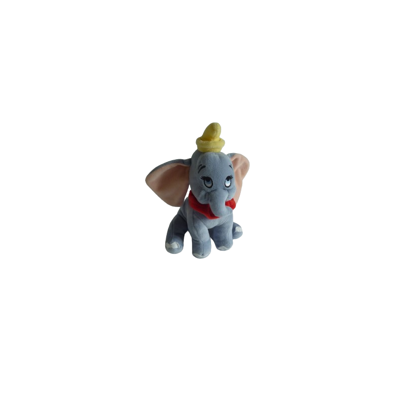 Doudou peluche Dumbo 19 cm environ gris bleu intérieur des oreilles pêche chapeau jaune collerette rouge. Etat : Comme neufDestinataire :