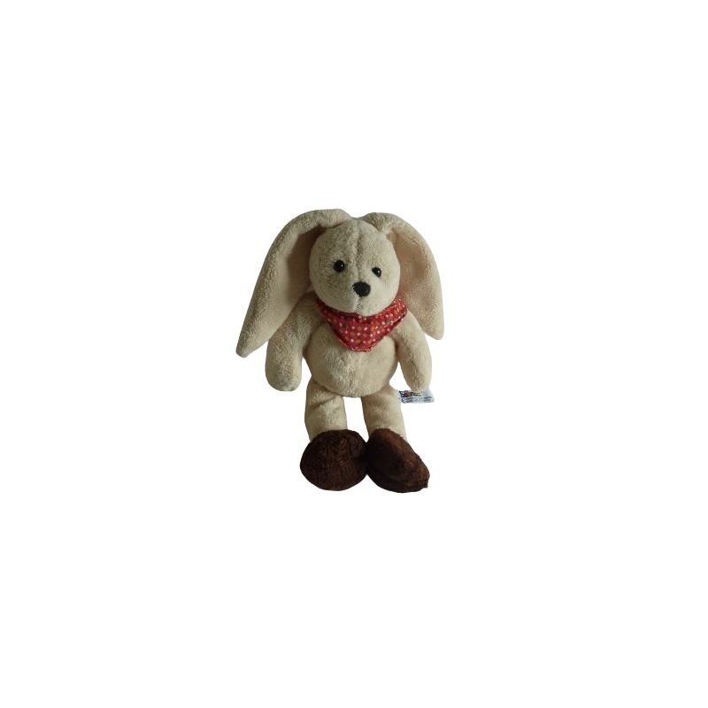 Doudou peluche lapin 30 cm environ sans compter les oreilles, billes au popotin pattes et oreilles, beige marron bandana rouge à motif. Etat : Comme neufDestinataire :