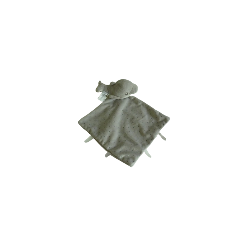 Doudou peluche mouchoir dauphin 14 cm environ de large, mouchoir 18x18 cm environ, gris blanc motif étoiles. Etat : Comme neuf