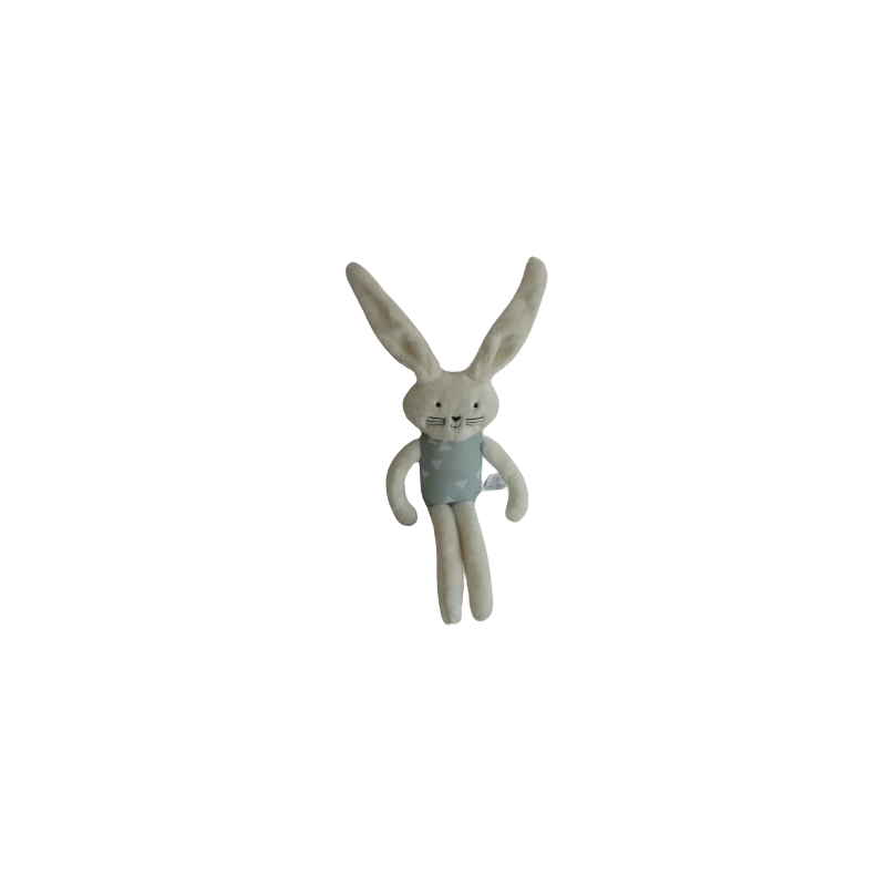 Doudou peluche lapin43 cm environ oreilles comprises, blanc vert motif. Etat : Comme neufDestinataire :