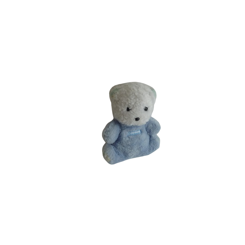 Doudou peluche ours 15 cm environ, grelot, bleu blanc. Etat : Bon étatDestinataire :
