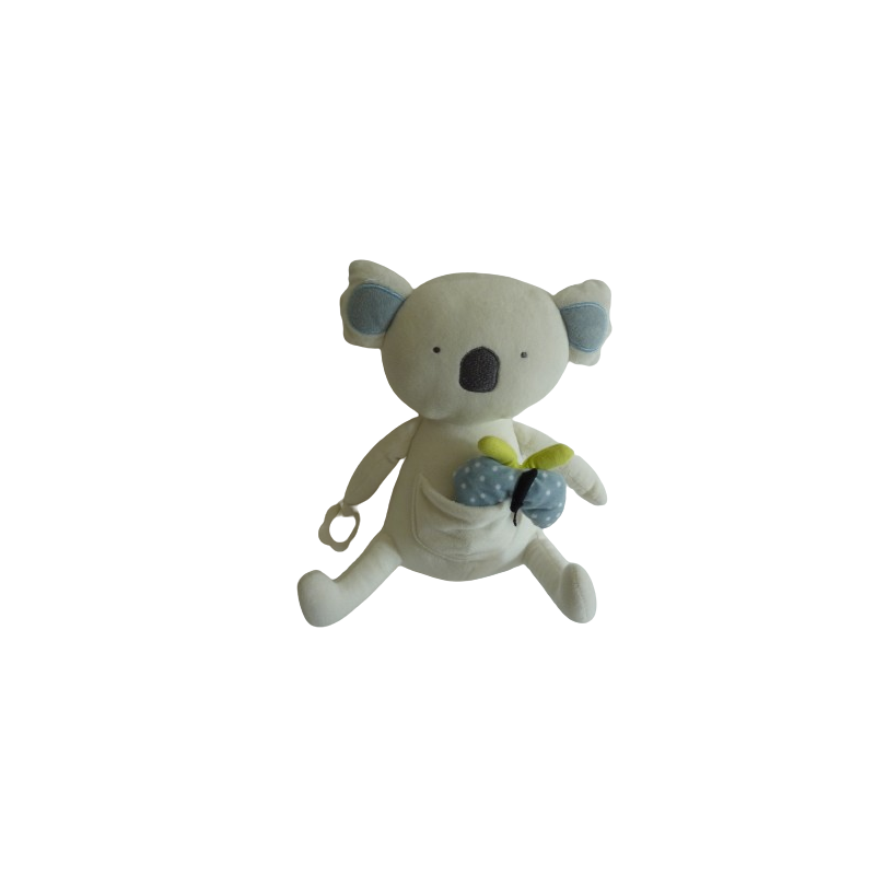 Doudou peluche éveil koala 24 cm environ position assise, bruit papier froissé sur le papillon, anneau dentition, blanc. Etat : Très bon état juste l'anneau dentition abîmé