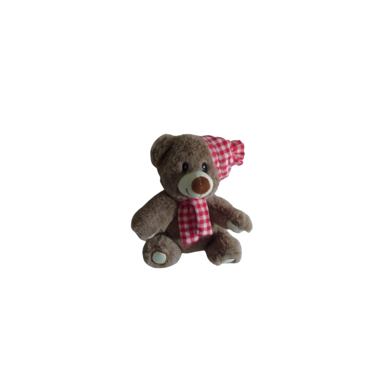 Doudou peluche ours position assise 19 cm environ, marron écru écharpe et bonnet carreaux rouge blanc. Etat : comme neufDestinataire :