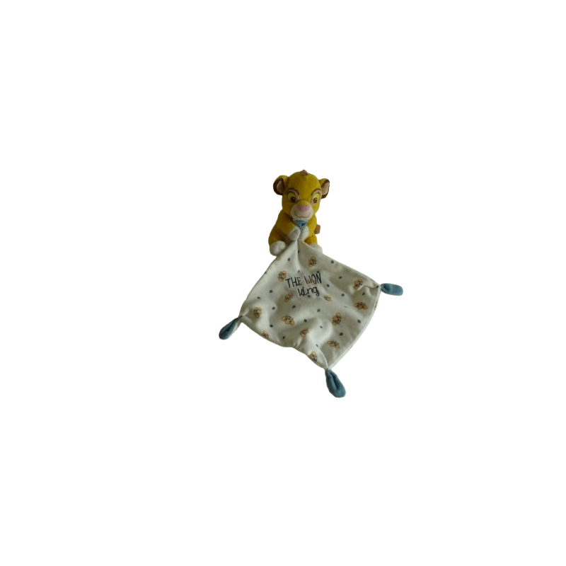 Doudou peluche lion 14 cm environ jaune blanc, mouchoir 17x17 cm environ blanc motif tête de lion The Lion King brodé. Etat : Comme neufDestinataire :