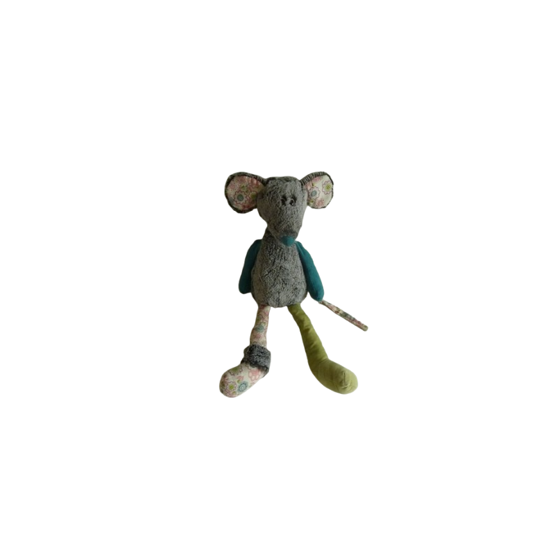 Doudou peluche souris 44 cm environ, gris vert turquoise tissu fleuri. Etat : Excellent état (étiquette marque coupée, la tête bascule un peu mais rien de méchant)Destinataire :