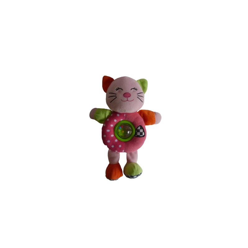 Doudou peluche éveil chat 28 cm environ, rose vert orange boule à grelot. Etat : La peluche est en parfait état (juste couleur bien passée sous un pied)