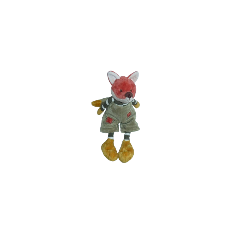 Doudou peluche renard 30 cm environ, vert jaune orange écru. Etat : Neuf