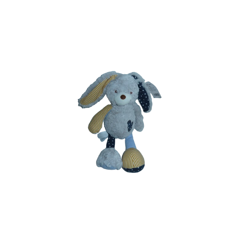 Doudou peluche lapin 38 cm environ, gris bleu rayures blanc moutarde. Etat : Neuf