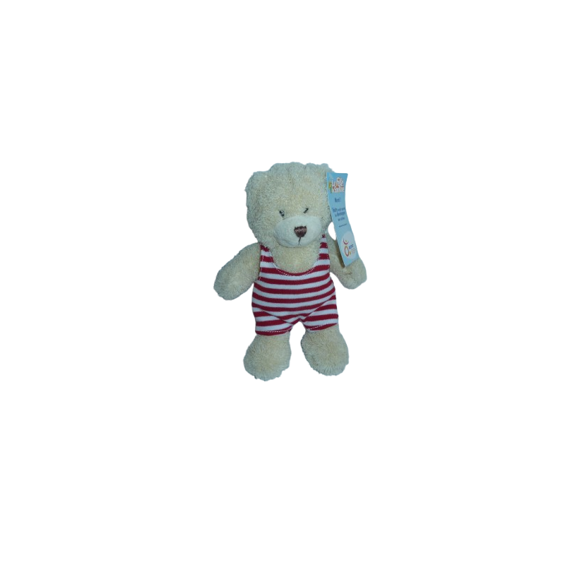 Doudou peluche ours 23 cm environ, écru salopette rayures blanc rouge. Etat : NeufDestinataire :