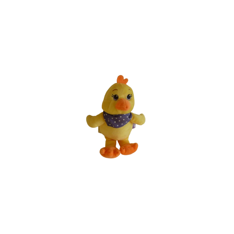 Doudou peluche poussin 24 cm environ, jaune orange bandana violet pois blanc. Etat : Comme neufDestinataire :