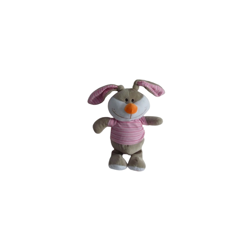Doudou peluche lapin 35 cm environ, gris tshirt et intérieur des oreilles à rayures, nez orange, Lapin Choco brodé sous une patte. Etat : Comme neufDestinataire :