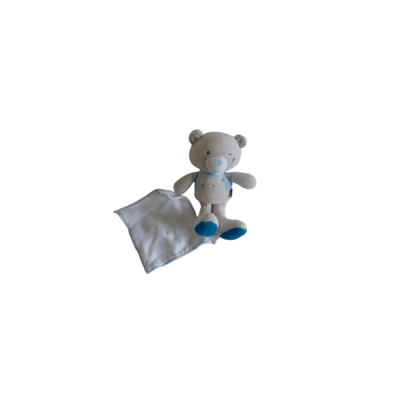 Doudou peluche ours 21 cm environ, gris bleu motif étoiles, mouchoir blanc 13x13 cm environ, Un petit message brodé. Etat : Parfait état (étiquette informations coupée)Destinataire :