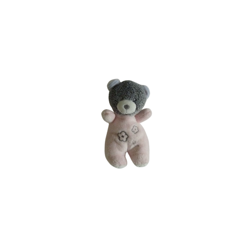 Doudou peluche ours 20 cm environ, grelot, rose gris motif fleurs. Etat : Comme neufDestinataire :