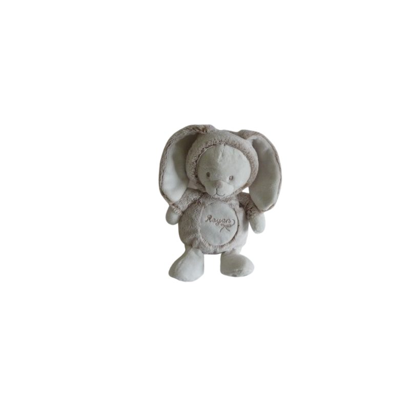 Doudou peluche ours déguisé en lapin 27 cm environ, blanc marron chiné, ATTENTION ROYAN BRODE. Etat : Comme neuf (Royan Brodé)Destinataire :