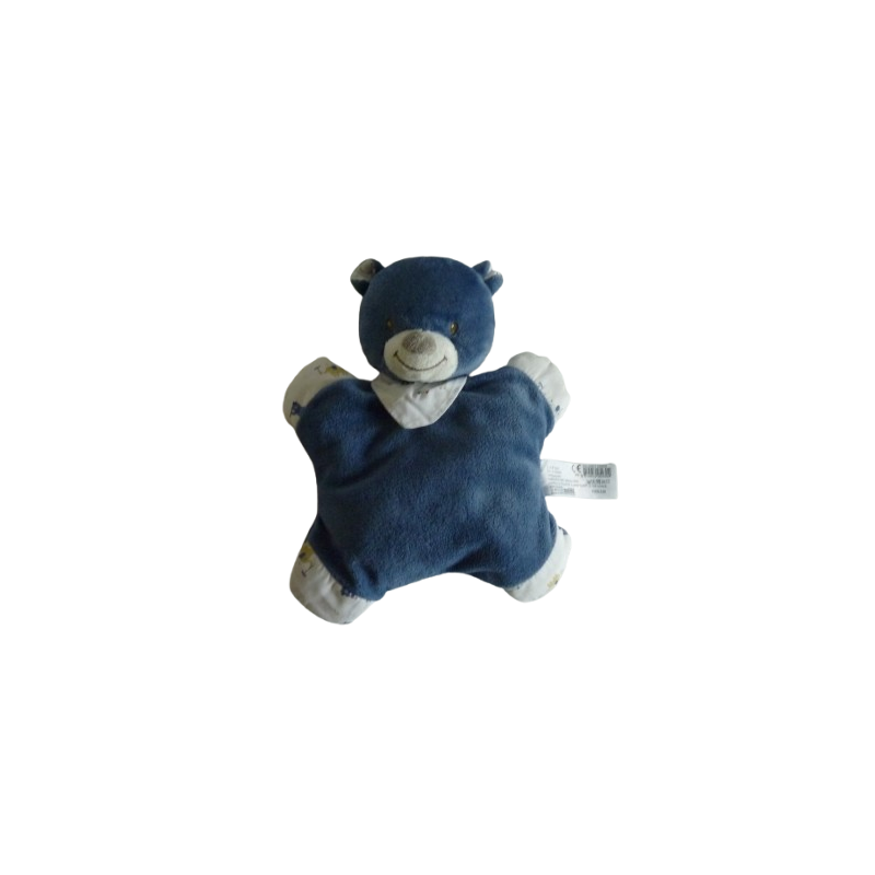 Doudou peluche ours 24 cm environ, grelot, bleu tissu blanc à motifs animaux. Etat : Très très bon étatDestinataire :