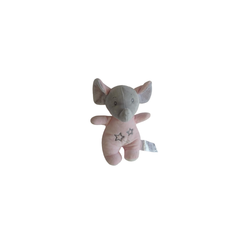 Doudou peluche éléphant 21 cm environ, grelot, rose gris rayures motif étoiles. Etat : Comme neufDestinataire :
