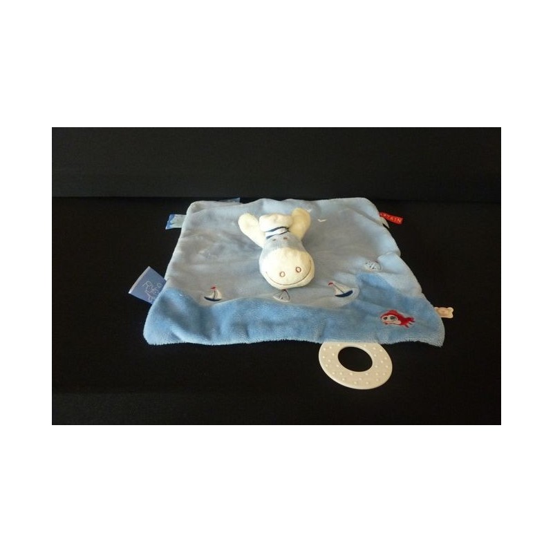 Description du doudou : Doudou plat âne de 28x26cm environ, anneau de dentition. Coloris : bleu, blanc, motifs, poisson, bateaux… Etat : Comme neuf. Produit original. DOUDOU DIFFICILE A TROUVER