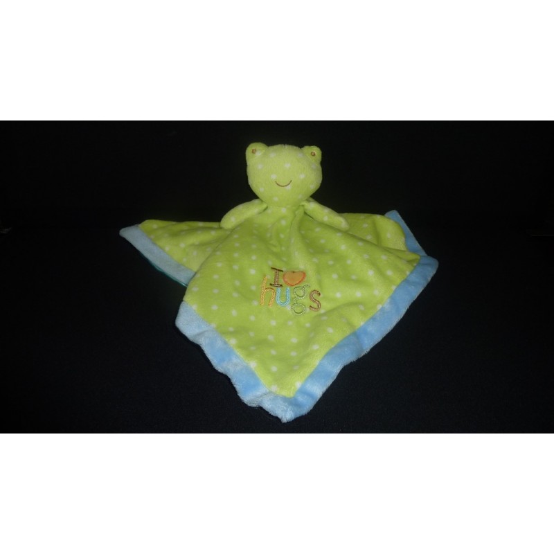description du doudou : Doudou plat grenouille, carré de 44x47 cm environ . Doudou super doux. Etat : Très bon état car tissu recto impeccable mais dessous tissu satin abîmé par beaucoup d'effilochage, rien de méchant, produit original.