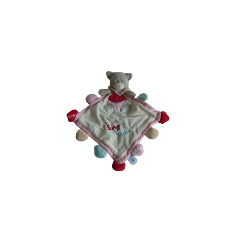Description du doudou : Doudou plat chat, forme losange, matière bruissante, grelot. Doudou super doux. Etat : Comme neuf. Produit original.