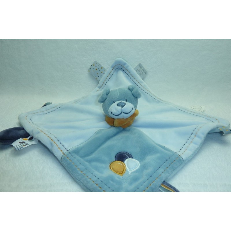 Description du doudou : Doudou plat chien bordé d'étiquettes, attache tétine. Coloris : bleu, motif ballons. Doudou super doux. Etat : Neuf sans étiquette boutique. Produit original. DOUDOU DIFFICILE A TROUVER