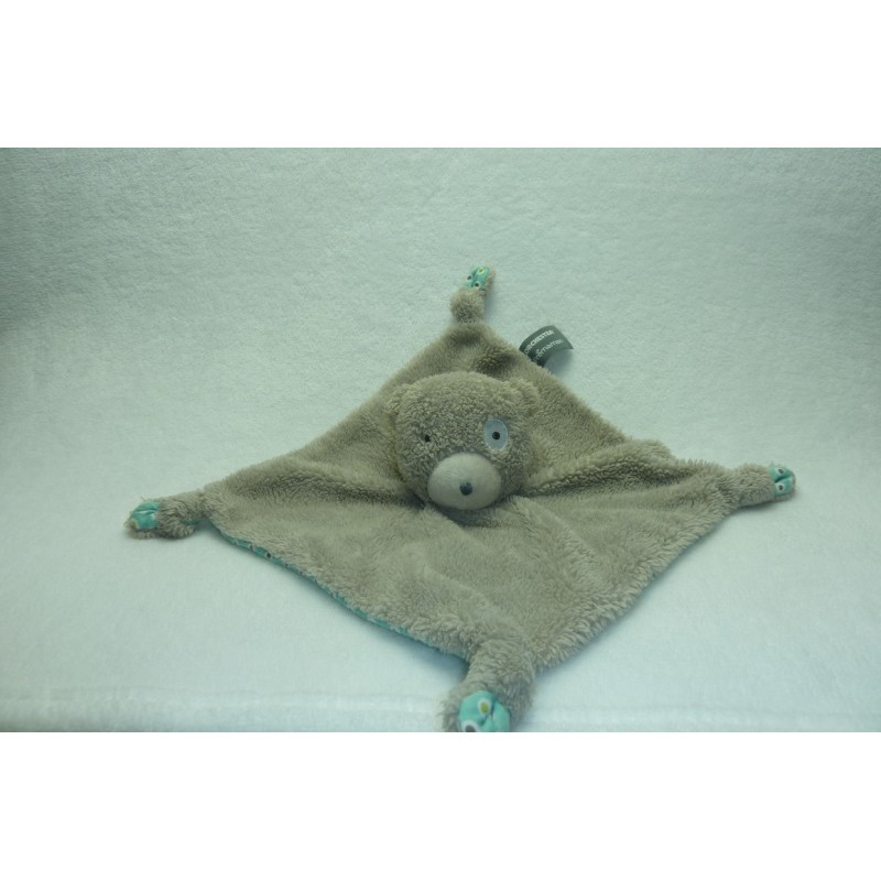 Description du doudou : Doudou plat ours, 4 nouages. Coloris : taupe, turquoise petits pois au verso. Doudou super doux. Etat : Neuf sans étiquette boutique. DOUDOU DIFFICILE A TROUVER