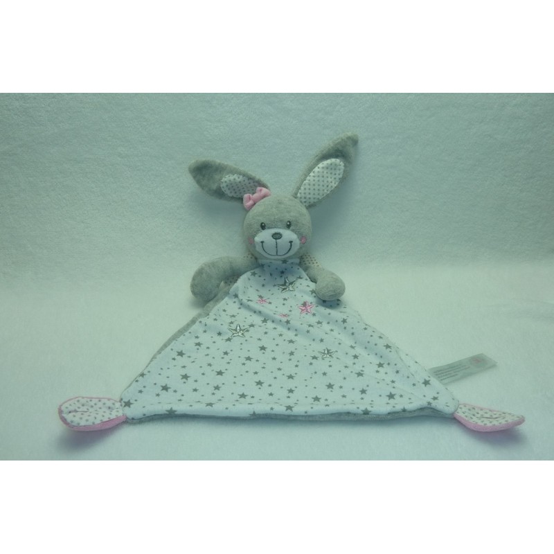 Description du doudou : Doudou plat lapin de 34 cm environ de longueur oreilles comprises. Coloris : gris, blanc étoilé. Etat : Très bon état . Produit original. DOUDOU DIFFICILE A TROUVER