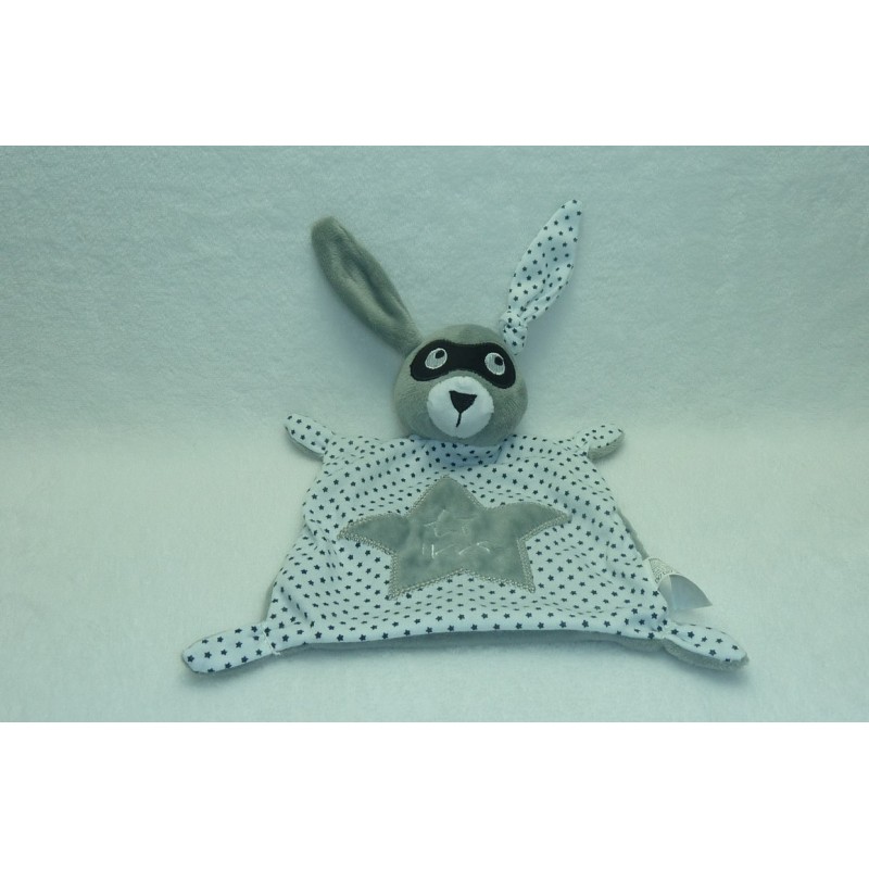 Description du doudou : Doudou plat lapin de 29 cm environ de longueur oreilles comprises. Coloris : gris, tissu blanc étoilé. Etat : Comme neuf