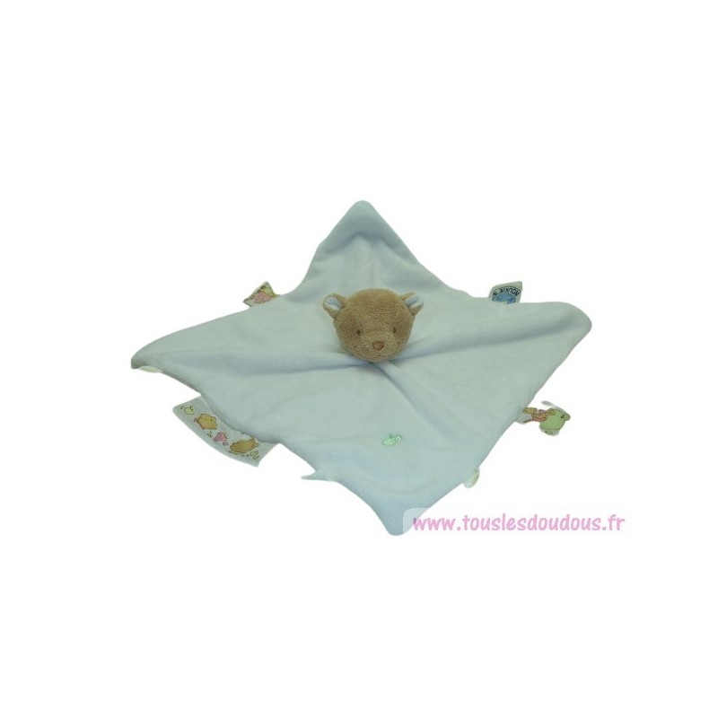 Doudou plat ours blanc bordé d'étiquette 28x28 cm environ. Etat : Très bon état (coins au verso légèrement jauni rien de méchant. SOS DOUDOU DIFFICILE A TROUVER.