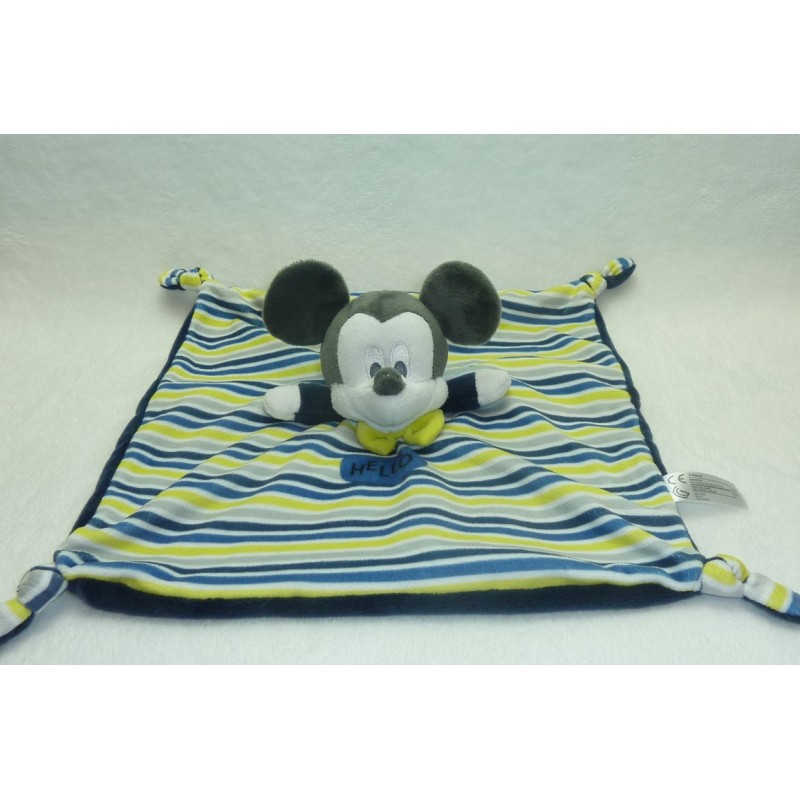 Description du doudou : Doudou plat souris de 29x27 cm environ, 4 nouages. Coloris : rayures hello, bleu marine au verso. Doudou super doux. Etat : Comme neuf. Produit original. DOUDOU DIFFICILE A TROUVER