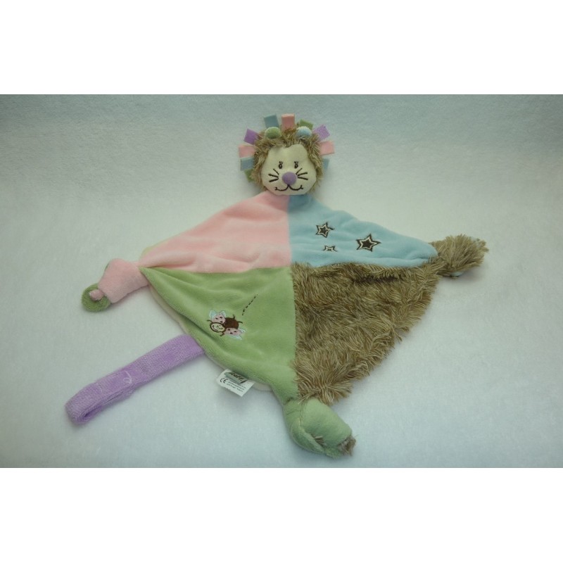 Description du doudou : Doudou plat lion de 39 cm environ de longueur, attache tétine par velcro, 3 nouages. Coloris : bleu, rose, vert, marron, écru, motifs : étoiles, coccinelle. Etat : Neuf sans étiquette boutique. Produit original. DOUDOU DIFFICILE A TROUVER