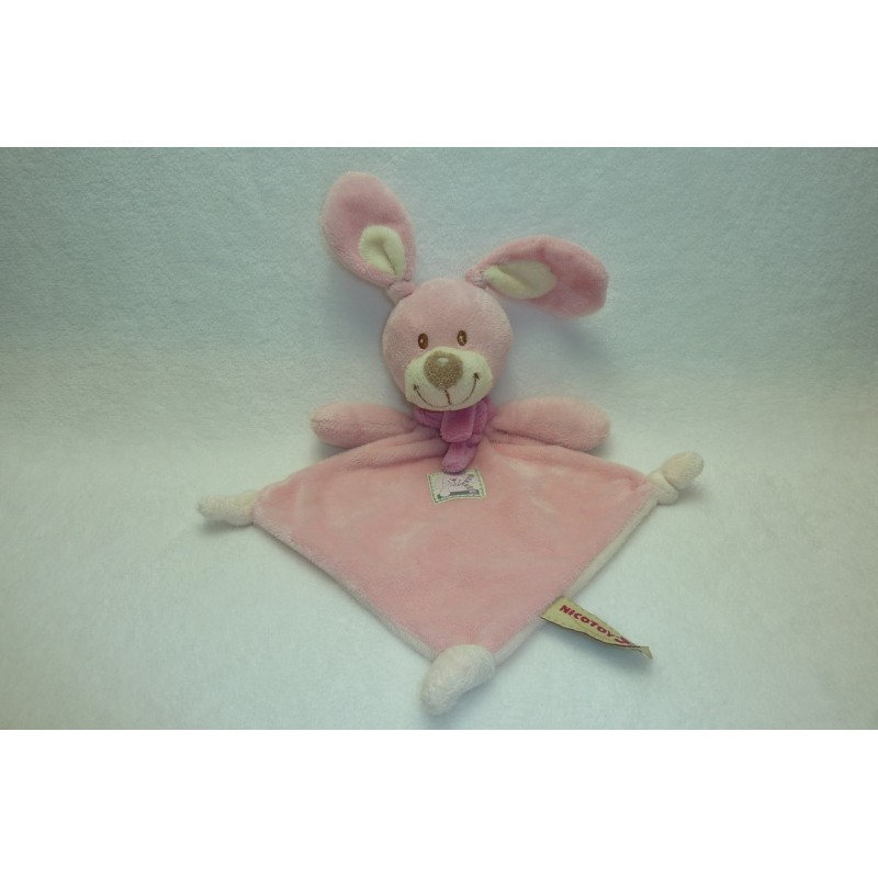 Description du doudou : Doudou plat lapin forme losange de 40 cm environ de longueur avec les oreilles, 3 nouages. Coloris : rose, blanc, écusson lapin. Etat : Comme neuf. Produit original. DOUDOU DIFFICILE A TROUVER